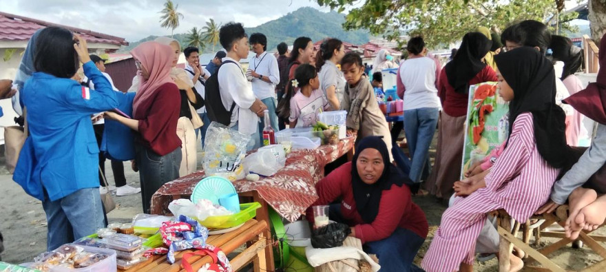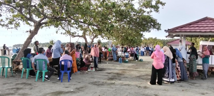 kegiatan terlihat suasana yang penuh keakraban antara para dosen dan masyarakat setempat. Para peserta berinteraksi langsung dengan para pelaku UMKM pesisir yang menampilkan berbagai produk, mulai dari makanan olahan, kue khas daerah, hingga kerajinan tangan dan kain tradisional. Para perempuan pesisir tampak antusias memamerkan hasil karya mereka, sementara para dosen dengan penuh perhatian meninjau dan berdialog mengenai proses produksi serta potensi pengembangan usaha.