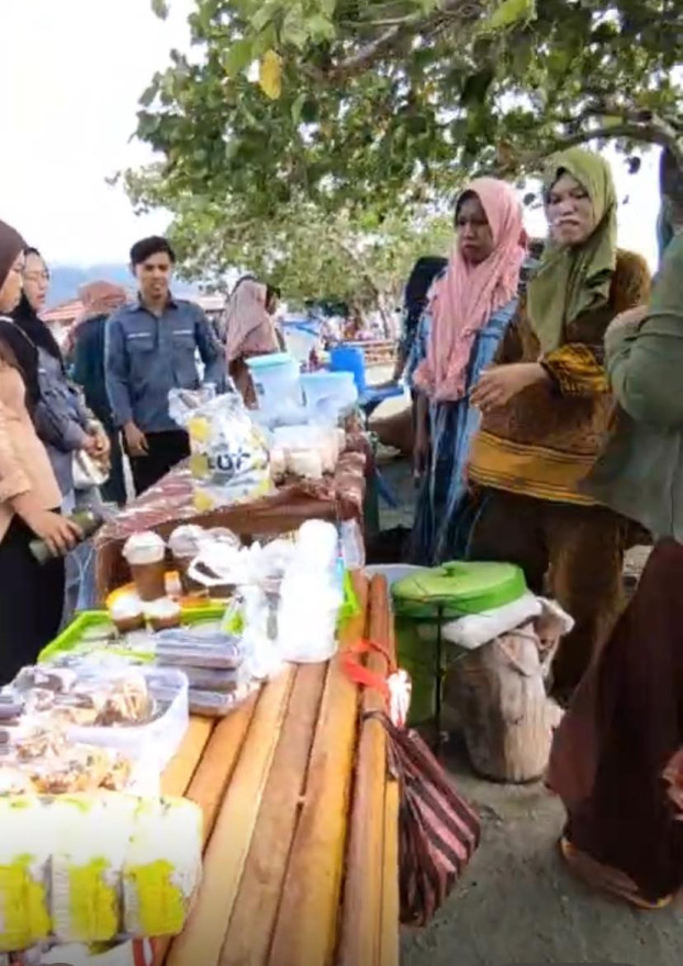 kegiatan terlihat suasana yang penuh keakraban antara para dosen dan masyarakat setempat. Para peserta berinteraksi langsung dengan para pelaku UMKM pesisir yang menampilkan berbagai produk, mulai dari makanan olahan, kue khas daerah, hingga kerajinan tangan dan kain tradisional. Para perempuan pesisir tampak antusias memamerkan hasil karya mereka, sementara para dosen dengan penuh perhatian meninjau dan berdialog mengenai proses produksi serta potensi pengembangan usaha.